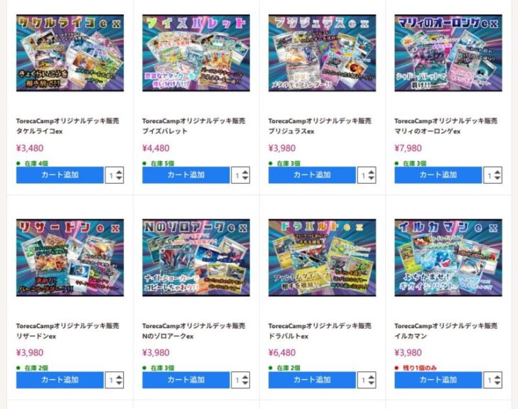 トレカキャンプでは、下記画像のように構築済みの環境デッキを販売しています。ここから2~3個選んで購入すれば、汎用カードはかなり揃います。