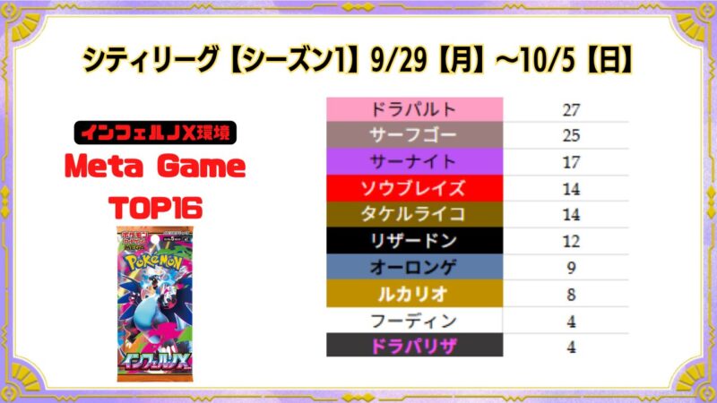 シティリーグ9/29【月】~10/3【金】ベスト16デッキまとめ X LINE 2025.09.292025.10.01 目次 シティリーグ9/29【月】秋葉原チェルモ(東京)竜星の嵐 十三店(大阪)トレカショップVOW(滋賀)ドラゴンスター秋葉原駅前店(東京)シティリーグ9/30【火】バトロコ 柏駅前(千葉)竜のしっぽ 布施店(大阪)バトロコ 藤沢駅北口(神奈川)シティリーグ10/1【水】Torecacamp大須店(愛知)ポケ堂 仙台店(宮城)BOOKOFF 307号枚方池之宮店(大阪)シティリーグ10/2【木】シティリーグ10/3【金】竜星のPAO 立川店(東京)Card Secret 池袋(東京) シティリーグ9/29【月】 秋葉原チェルモ(東京) 大会結果 優勝 準優勝 TOP4 TOP4 TOP8 TOP8 TOP8 TOP8 TOP16 TOP16 TOP16 TOP16 TOP16 TOP16 TOP16 TOP16 竜星の嵐 十三店(大阪) 大会結果 優勝 準優勝 TOP4 TOP4 TOP8 TOP8 TOP8 TOP8 TOP16 TOP16 TOP16 TOP16 TOP16 TOP16 TOP16 TOP16 トレカショップVOW(滋賀) 大会結果 優勝 準優勝 TOP4 TOP4 TOP8 TOP8 TOP8 TOP8 TOP16 TOP16 TOP16 TOP16 TOP16 TOP16 TOP16 TOP16 ドラゴンスター秋葉原駅前店(東京) 大会結果 優勝 準優勝 TOP4 TOP4 TOP8 TOP8 TOP8 TOP8 TOP16 TOP16 TOP16 TOP16 TOP16 TOP16 TOP16 TOP16 シティリーグ9/30【火】 バトロコ 柏駅前(千葉) 大会結果 優勝 準優勝 TOP4 TOP4 TOP8 TOP8 TOP8 TOP8 TOP16 TOP16 TOP16 TOP16 TOP16 TOP16 TOP16 TOP16 竜のしっぽ 布施店(大阪) 大会結果 優勝 準優勝 TOP4 TOP4 TOP8 TOP8 TOP8 TOP8 TOP16 TOP16 TOP16 TOP16 TOP16 TOP16 TOP16 TOP16 バトロコ 藤沢駅北口(神奈川) 大会結果 優勝 準優勝 TOP4 TOP4 TOP8 TOP8 TOP8 TOP8 TOP16 TOP16 TOP16 TOP16 TOP16 TOP16 TOP16 TOP16 シティリーグ10/1【水】 Torecacamp大須店(愛知) 大会結果 優勝 準優勝 TOP4 TOP4 TOP8 TOP8 TOP8 TOP8 TOP16 TOP16 TOP16 TOP16 TOP16 TOP16 TOP16 TOP16 ポケ堂 仙台店(宮城) 大会結果 優勝 準優勝 TOP4 TOP4 TOP8 TOP8 TOP8 TOP8 TOP16 TOP16 TOP16 TOP16 TOP16 TOP16 TOP16 TOP16 BOOKOFF 307号枚方池之宮店(大阪) 大会結果 優勝 準優勝 TOP4 TOP4 TOP8 TOP8 TOP8 TOP8 TOP16 TOP16 TOP16 TOP16 TOP16 TOP16 TOP16 TOP16 シティリーグ10/2【木】 開催なし シティリーグ10/3【金】 竜星のPAO 立川店(東京) Card Secret 池袋(東京)