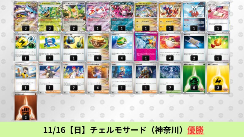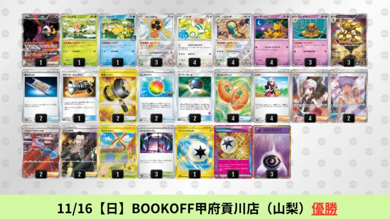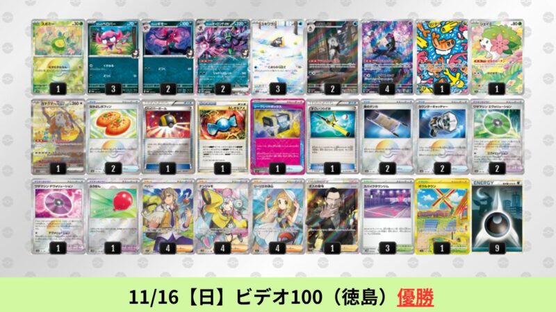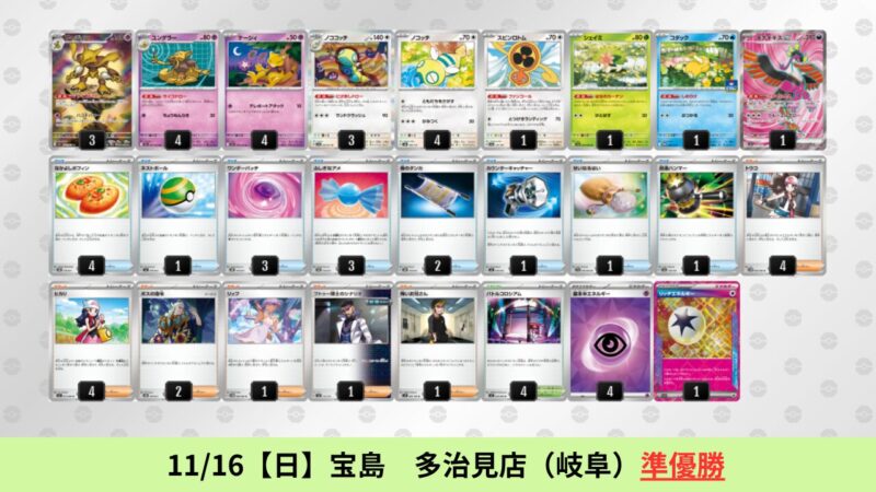 テラスタルバレット:あらゆるデッキがシェイミを抜いているため入賞率増加。理論上すべてのデッキに勝ちうるデッキ。メタさえ読めれば強気に行ける。マークも薄いため(マークできないため、余裕がない)、今週も勝ちそう。