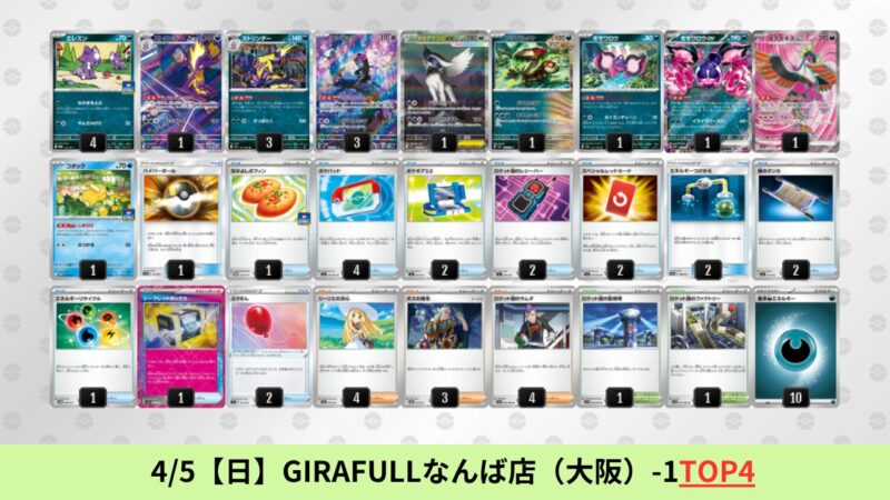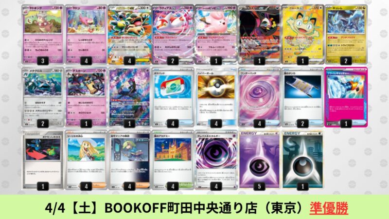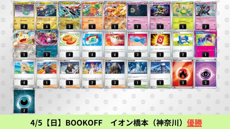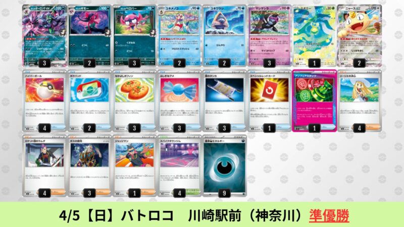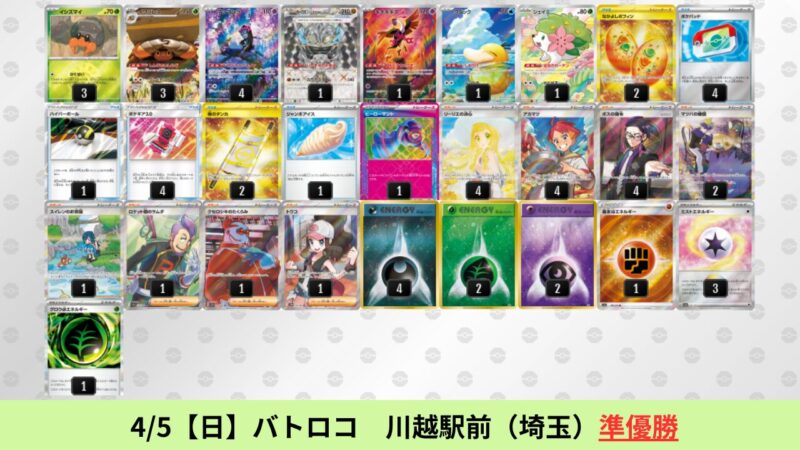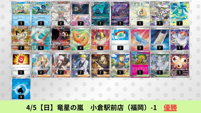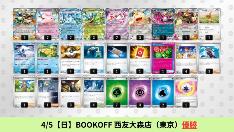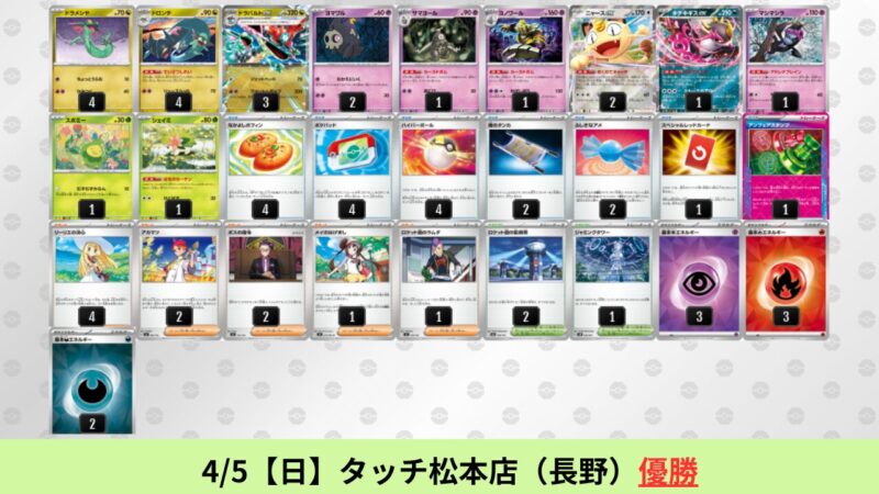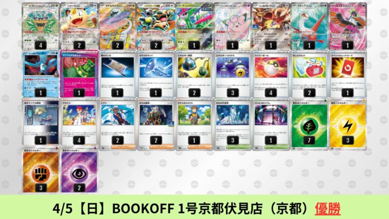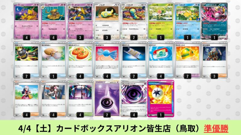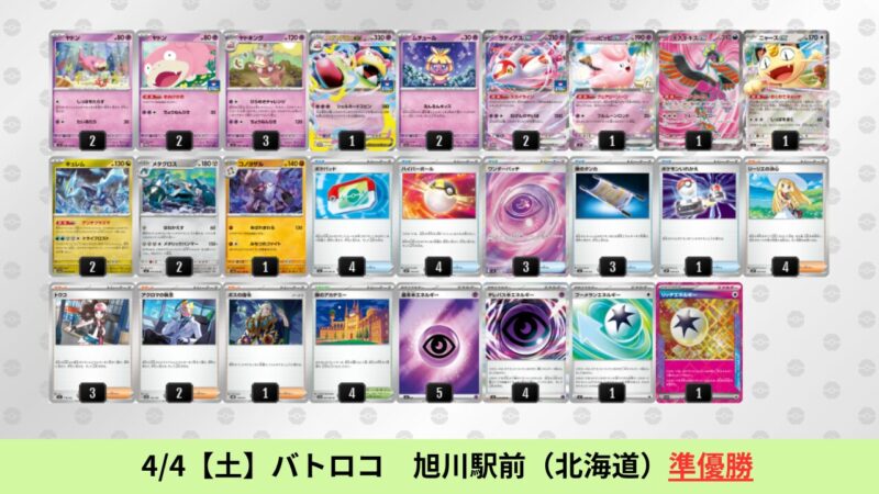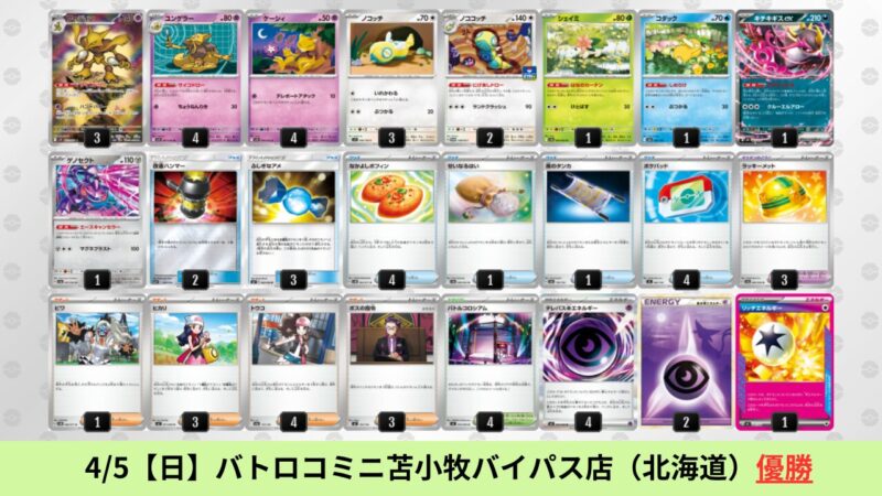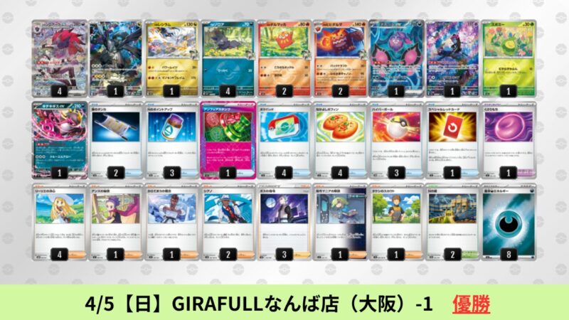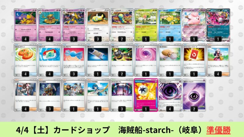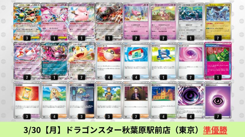 CL大阪は、ドラパルトを倒すために組まれた「たね主体の速攻デッキ」が中心。それらをメタるフーディンが勝ちデッキとなった大会であった。 - そのCL大阪を経た3/30【月】~4/5【日】の結果