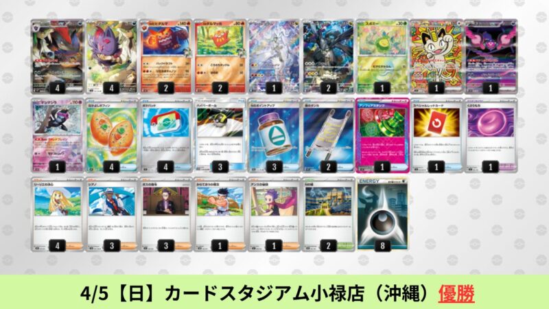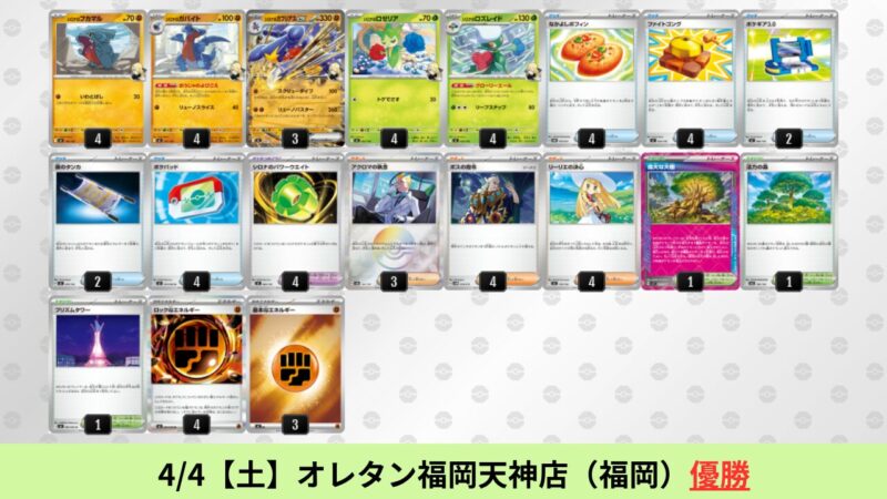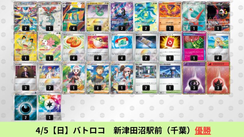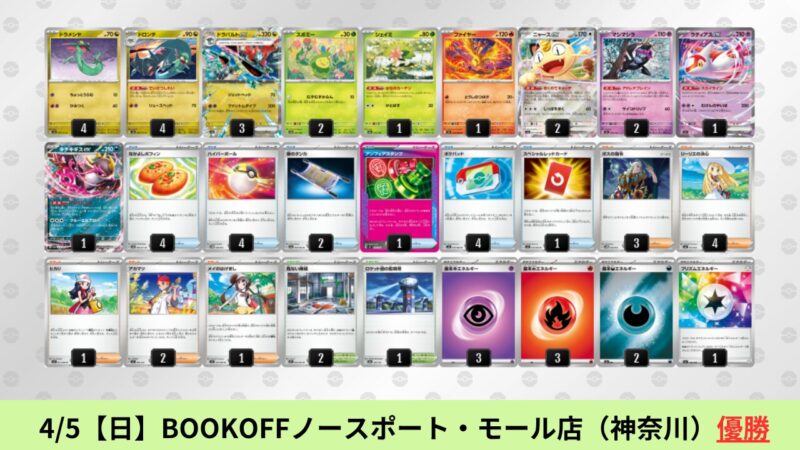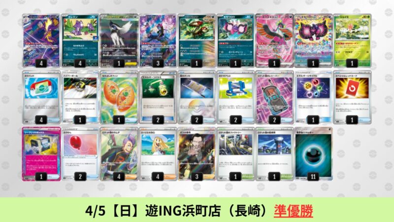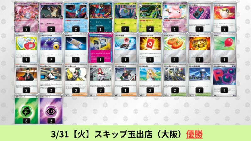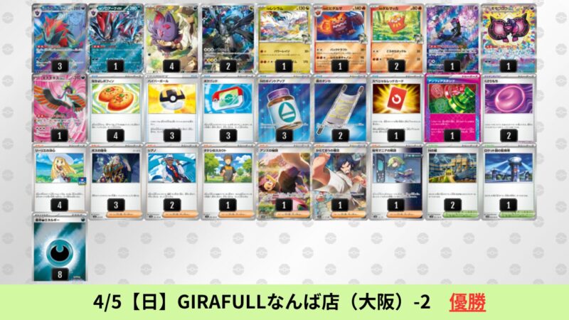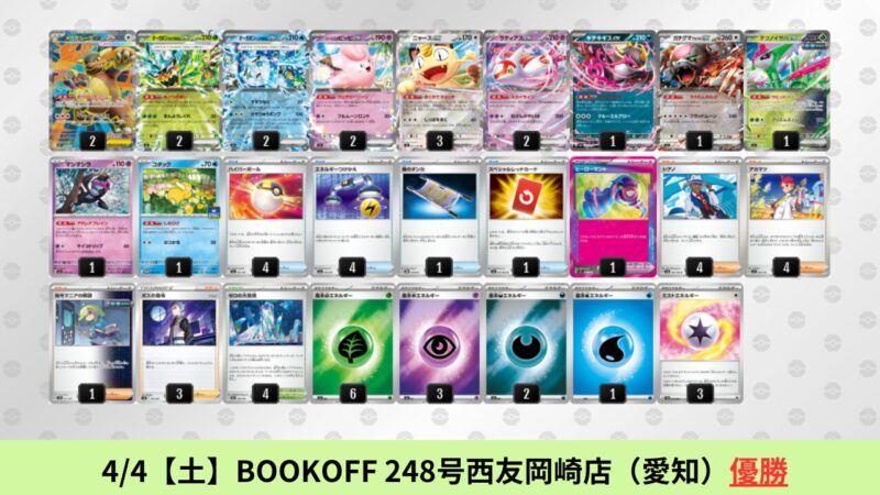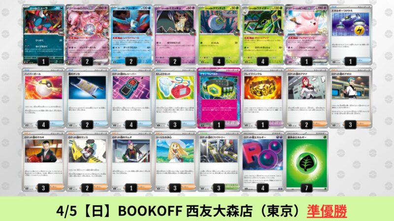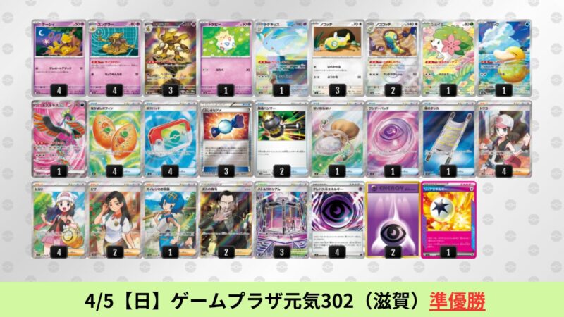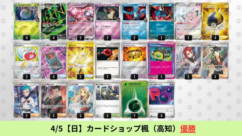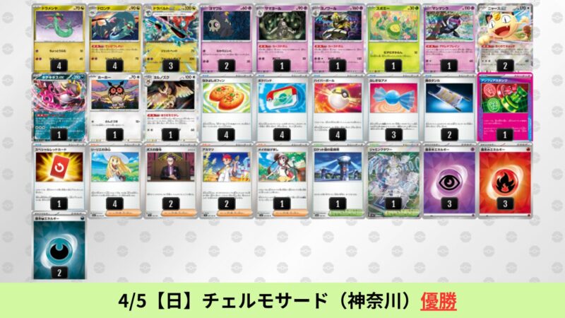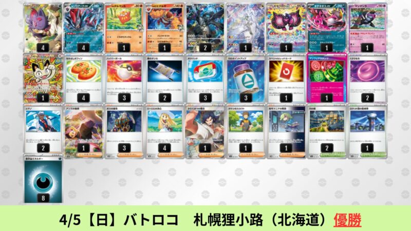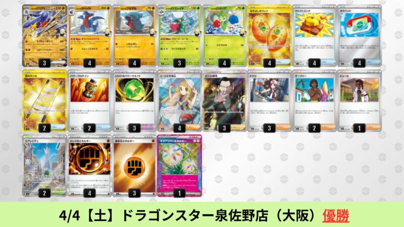 CL大阪は、ドラパルトを倒すために組まれた「たね主体の速攻デッキ」が中心。それらをメタるフーディンが勝ちデッキとなった大会であった。 - そのCL大阪を経た3/30【月】~4/5【日】の結果