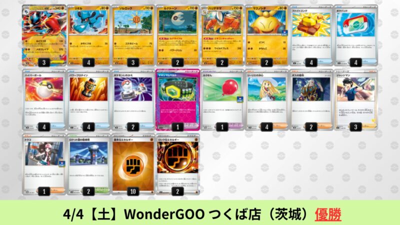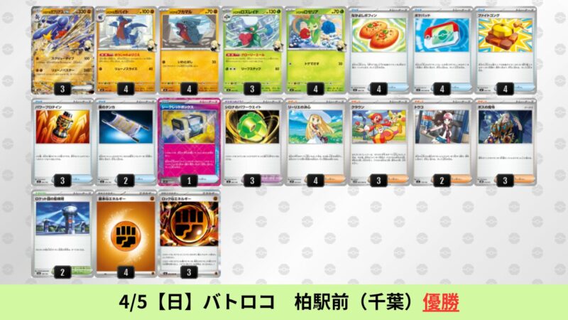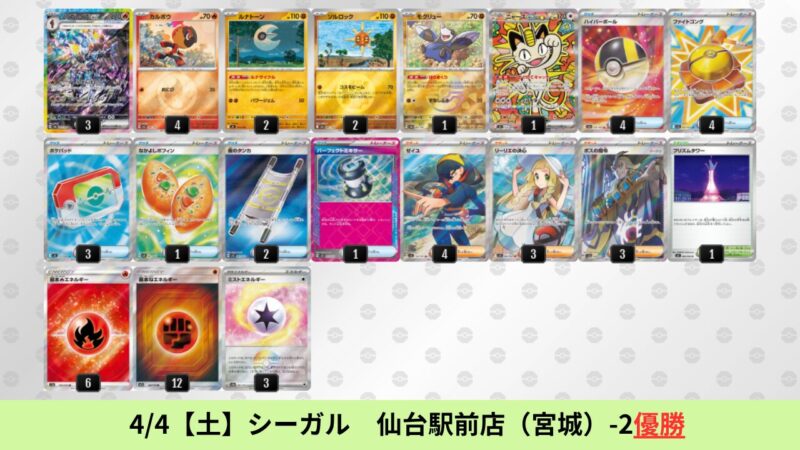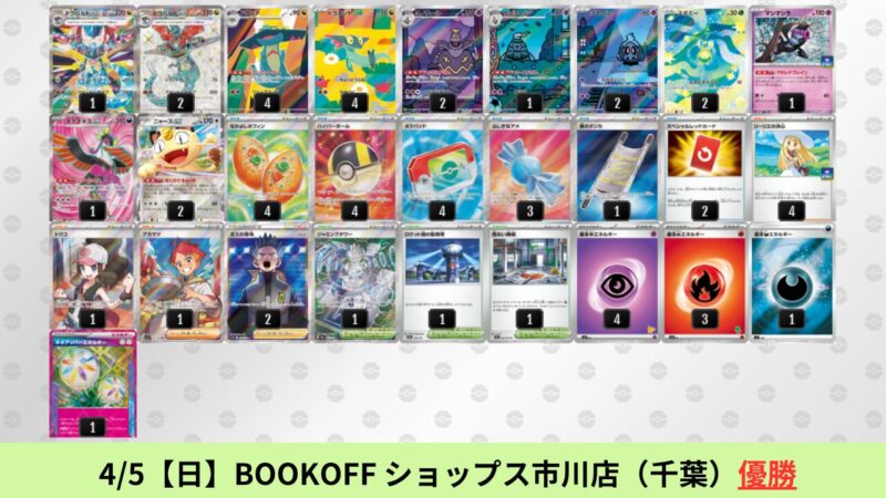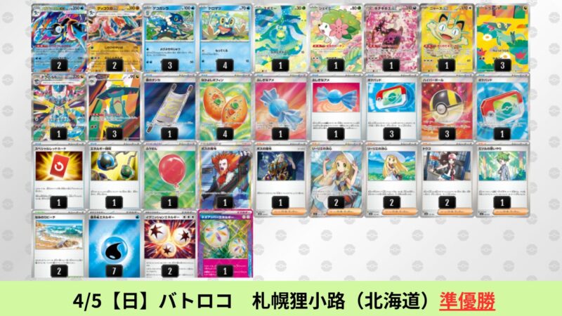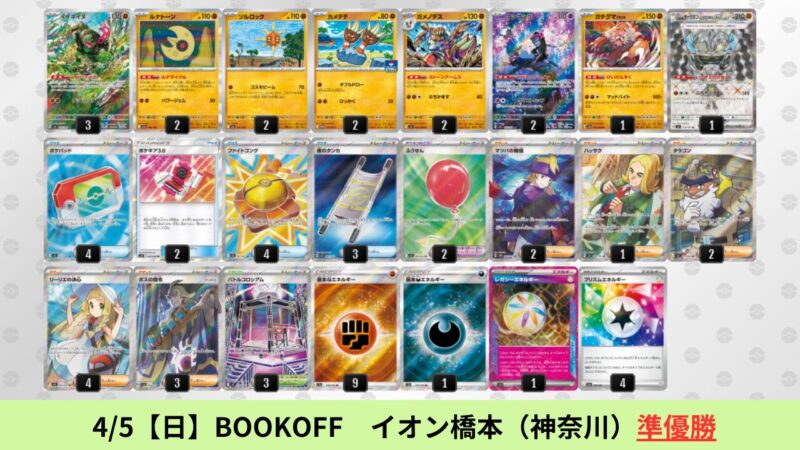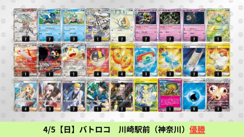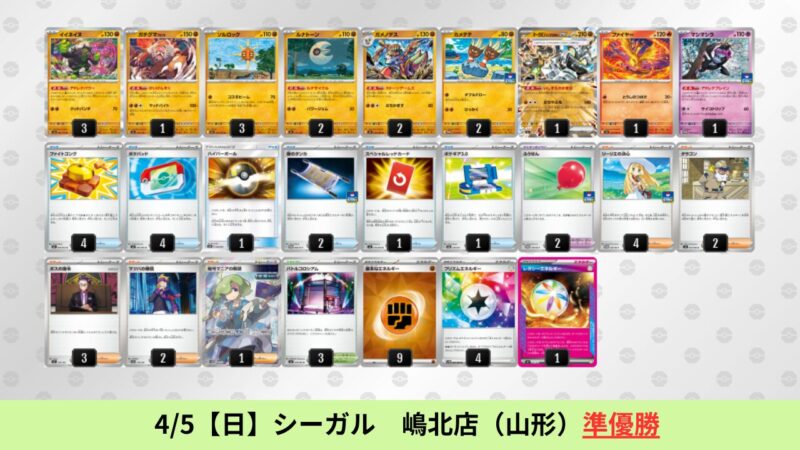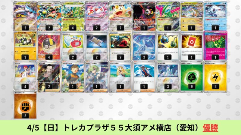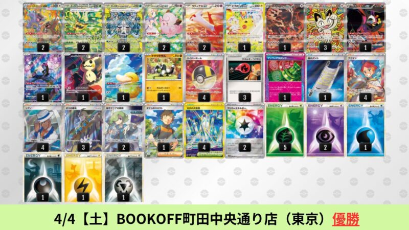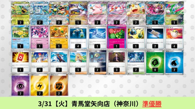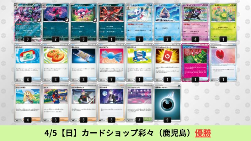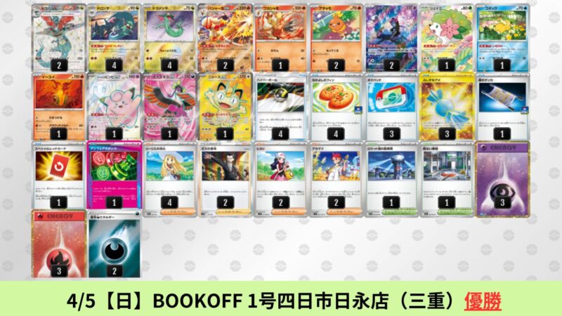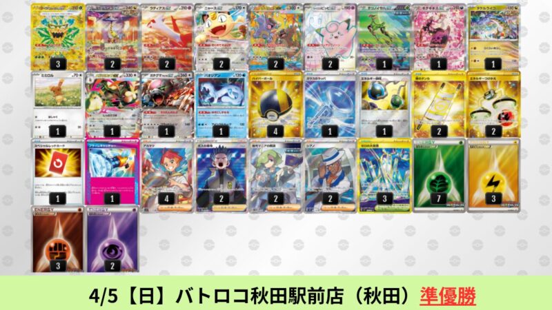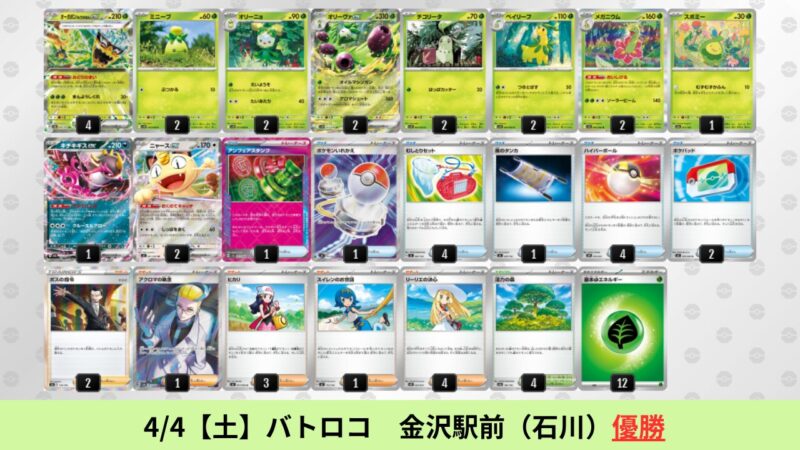 CL大阪は、ドラパルトを倒すために組まれた「たね主体の速攻デッキ」が中心。それらをメタるフーディンが勝ちデッキとなった大会であった。 - そのCL大阪を経た3/30【月】~4/5【日】の結果