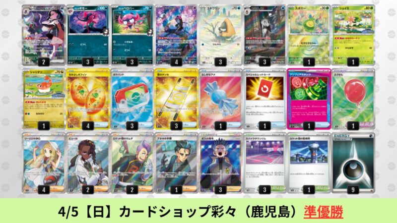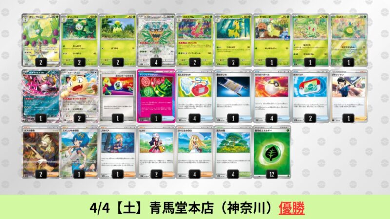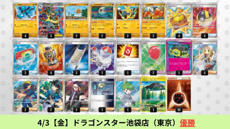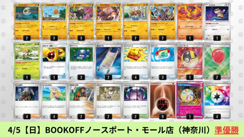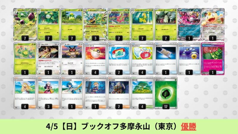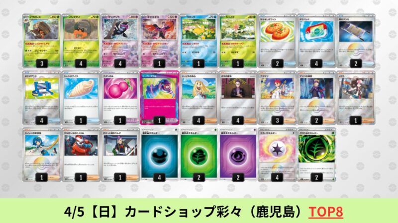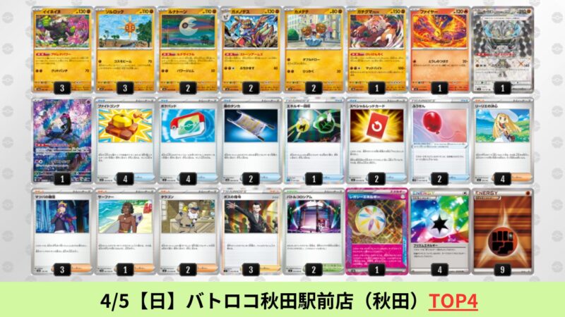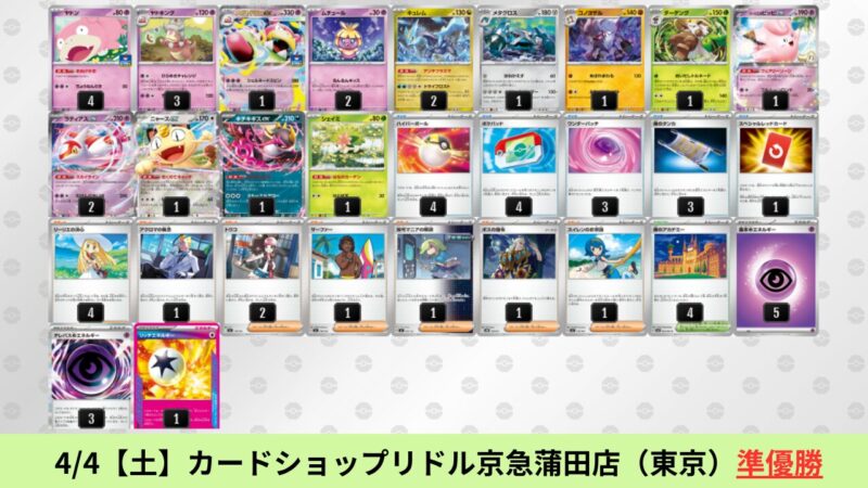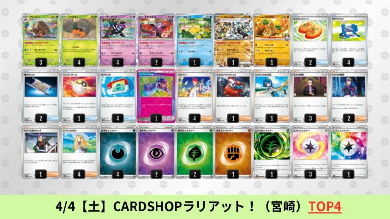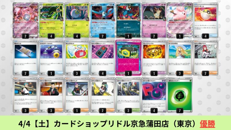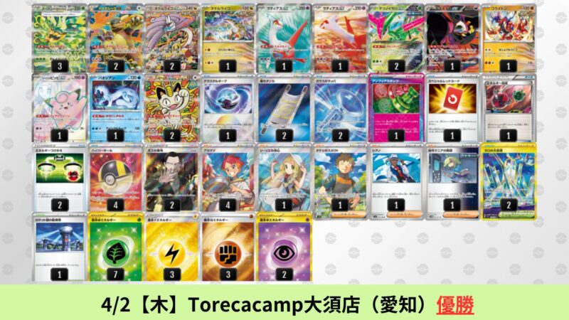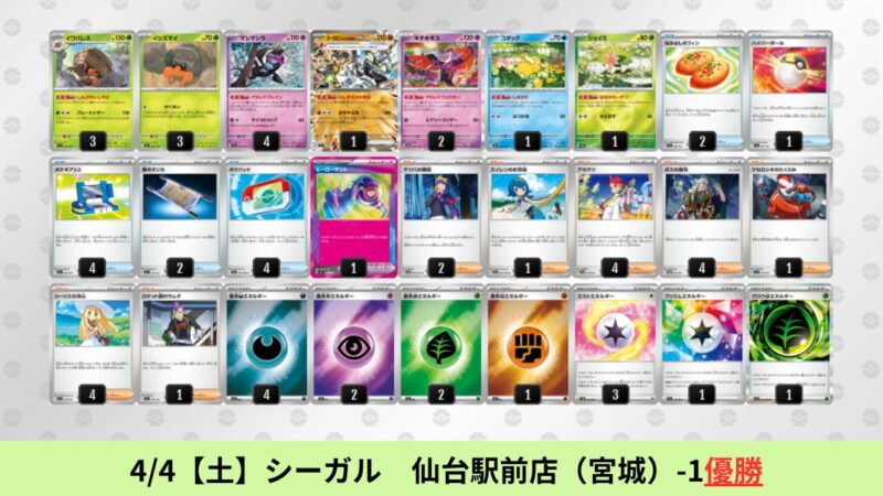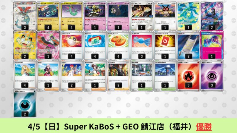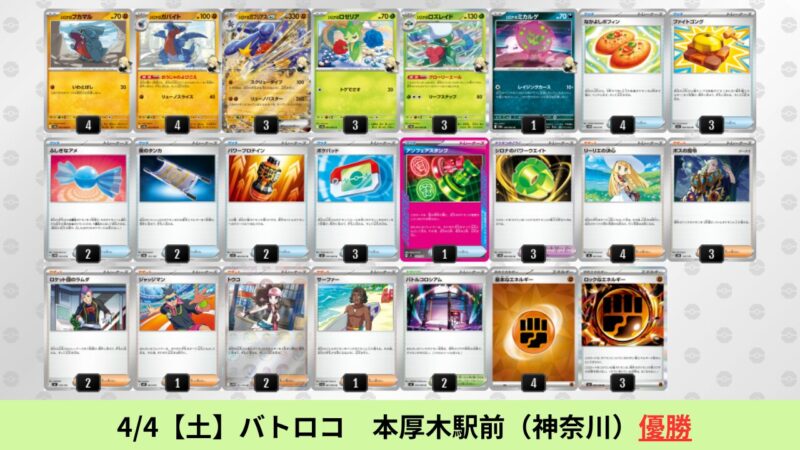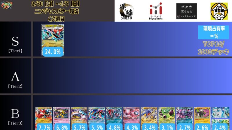 CL大阪は、ドラパルトを倒すために組まれた「たね主体の速攻デッキ」が中心。それらをメタるフーディンが勝ちデッキとなった大会であった。 - そのCL大阪を経た3/30【月】~4/5【日】の結果