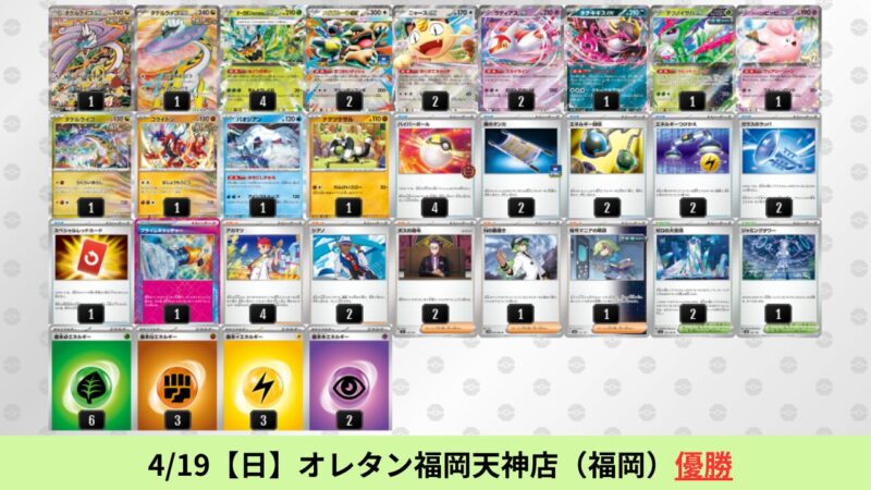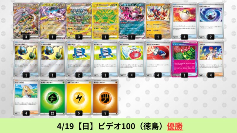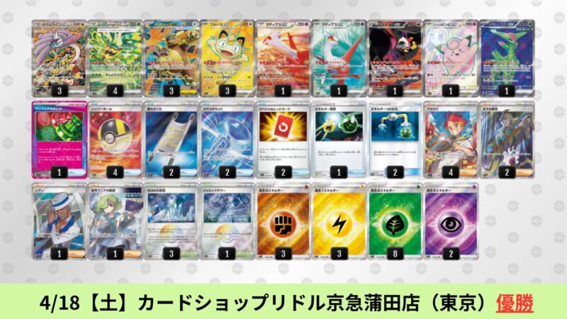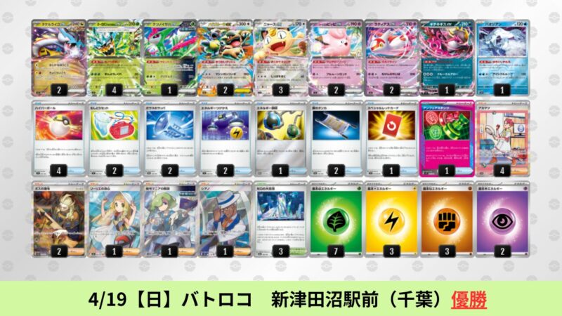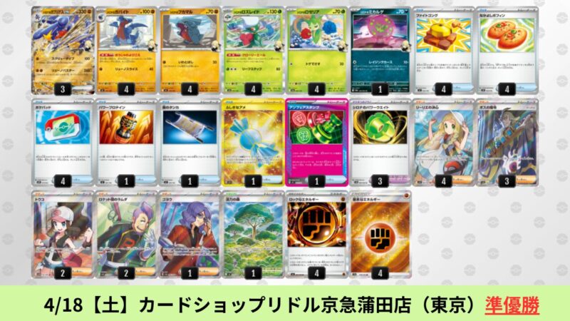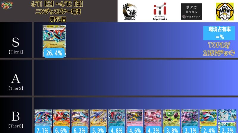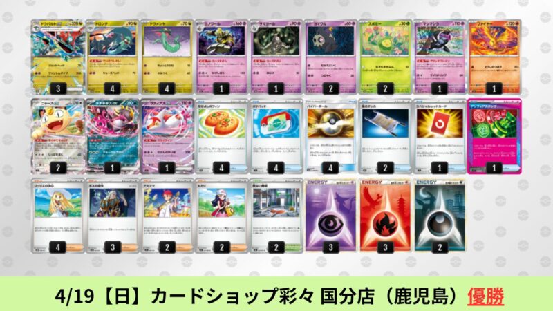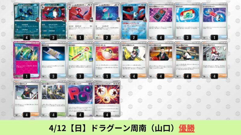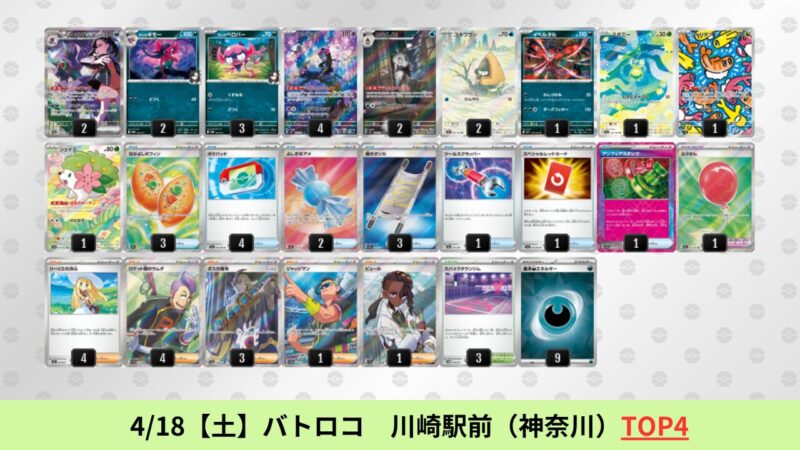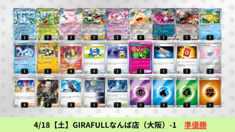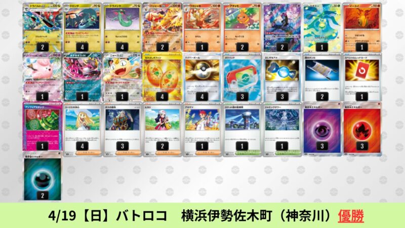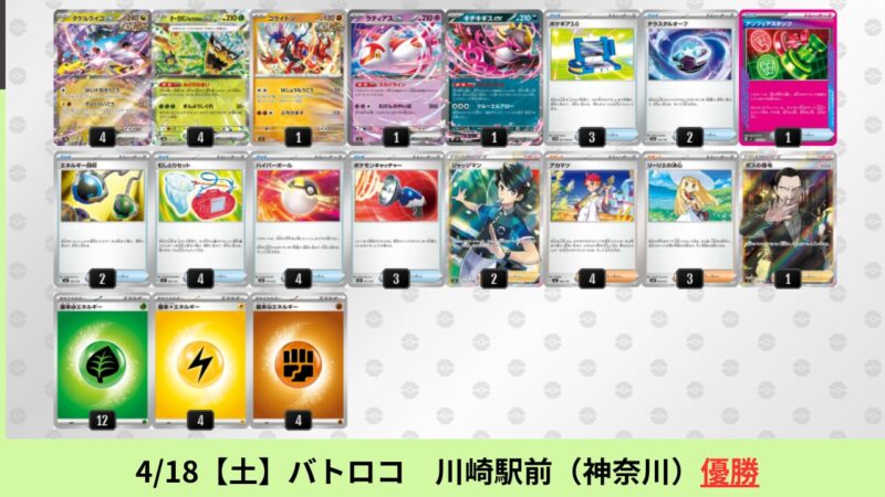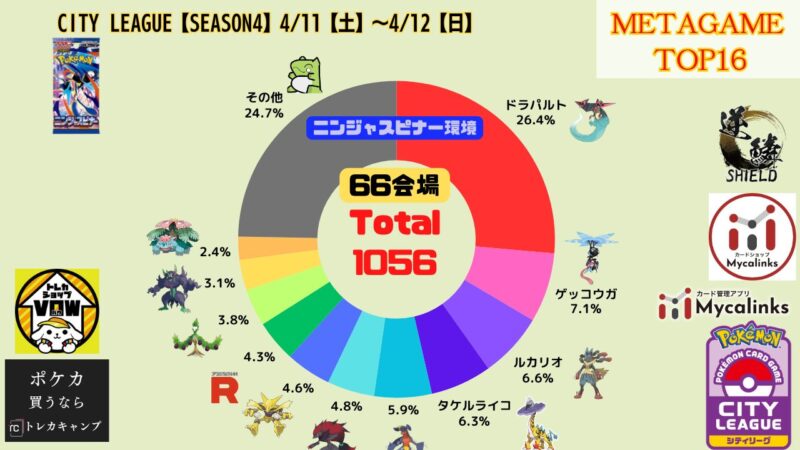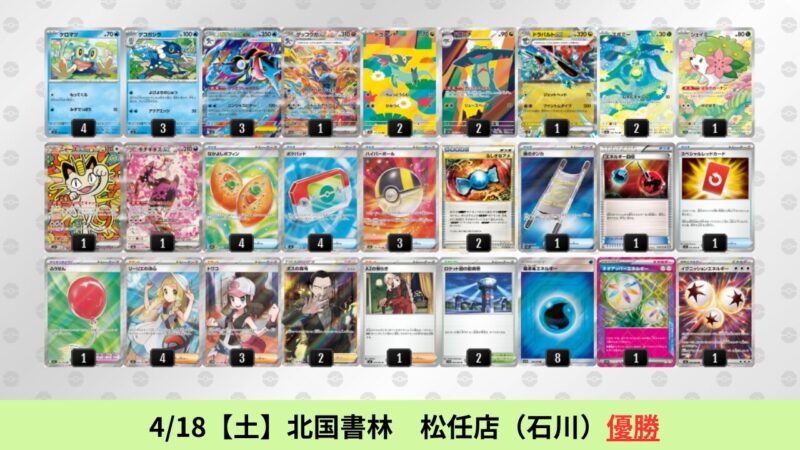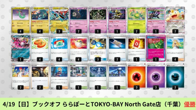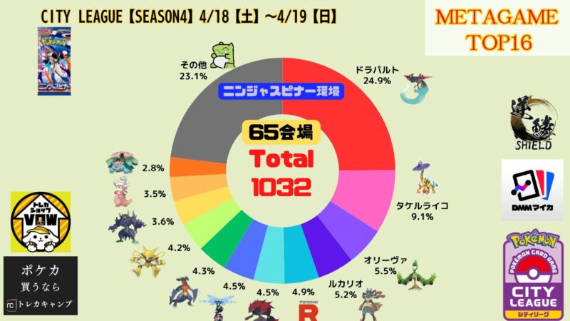 ドラパルトexを起点として、そのドラパルトexに強いたねポケモンex主体デッキ(タケルライコ、オーガポン等)、さらにそのたねポケモンex主体デッキに強い非ルールポケモンデッキ(フーディン、メタグロス、ドンカラス等)という構図をイメージせよ。環境をジャンル分けすると、この3ジャンルで環境が形成されている。 - 4/18【土】~4/19【日】の結果