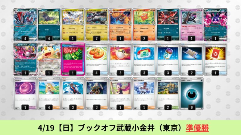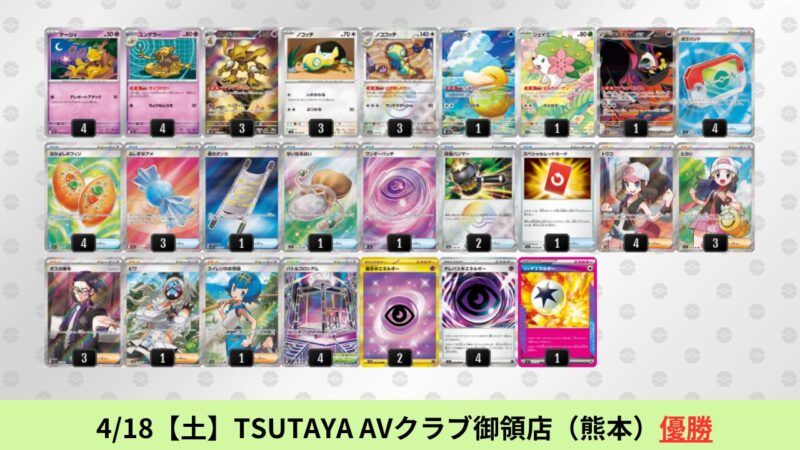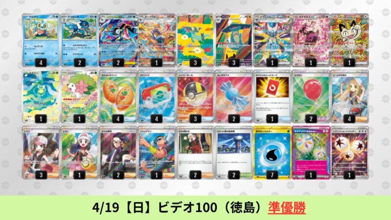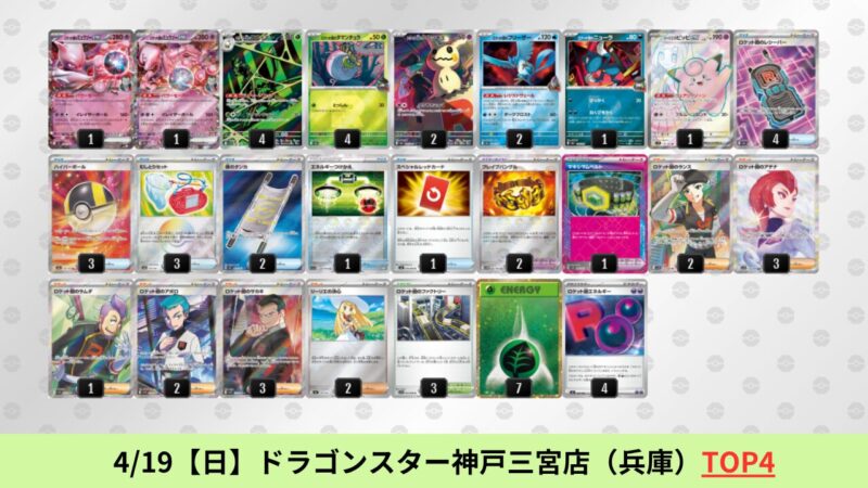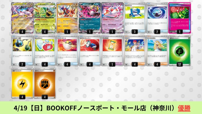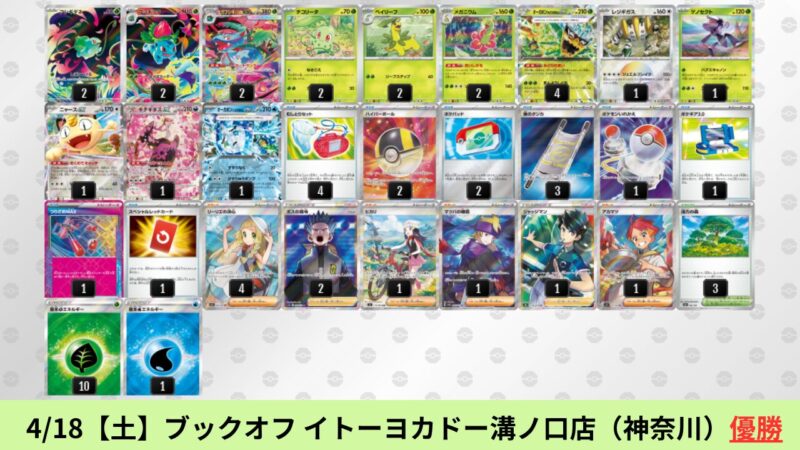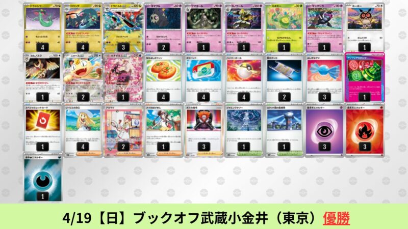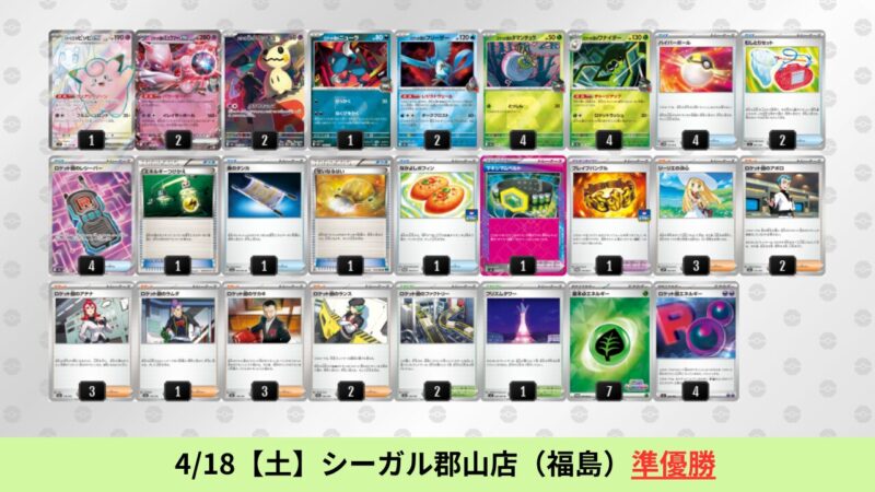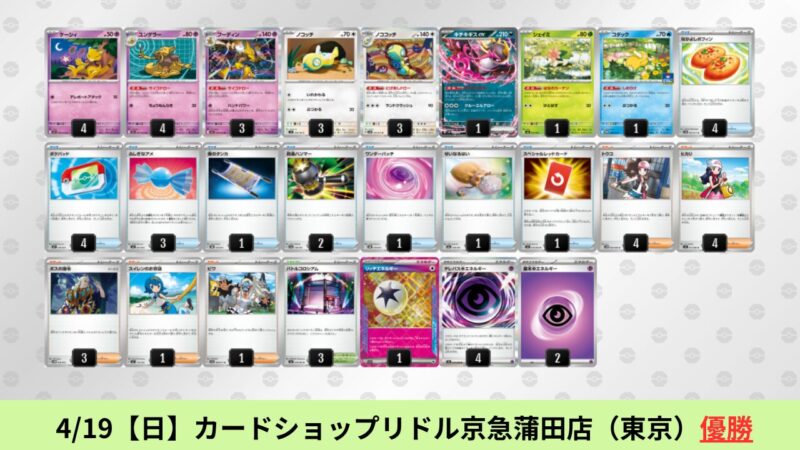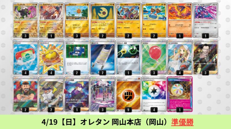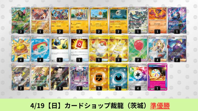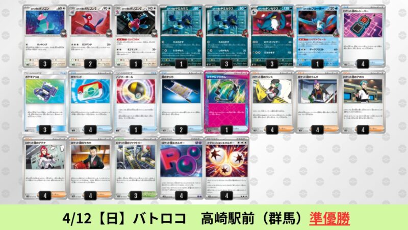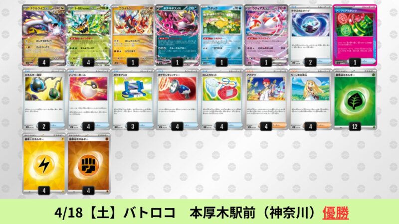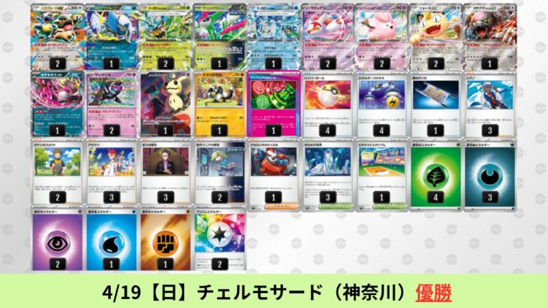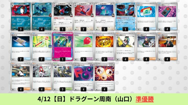 ドラパルトexを起点として、そのドラパルトexに強いたねポケモンex主体デッキ(タケルライコ、オーガポン等)、さらにそのたねポケモンex主体デッキに強い非ルールポケモンデッキ(フーディン、メタグロス、ドンカラス等)という構図をイメージせよ。環境をジャンル分けすると、この3ジャンルで環境が形成されている。 - 4/18【土】~4/19【日】の結果