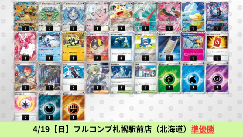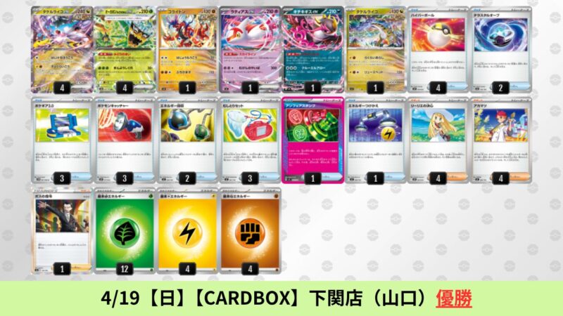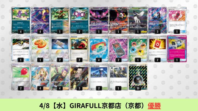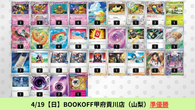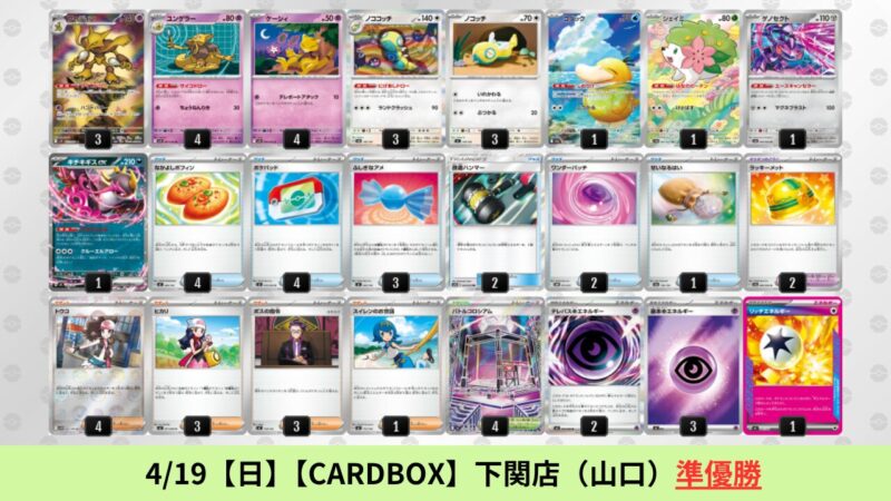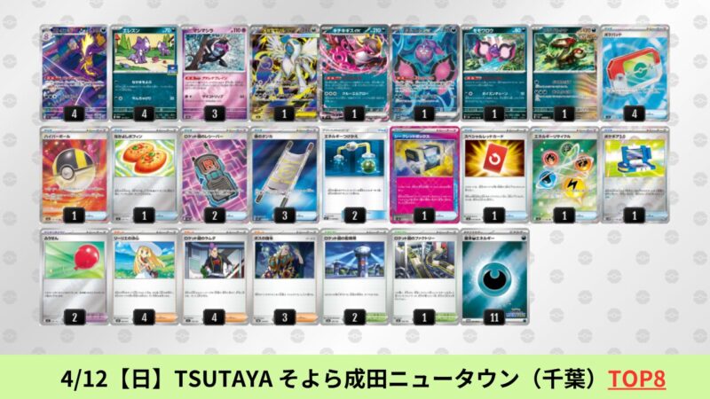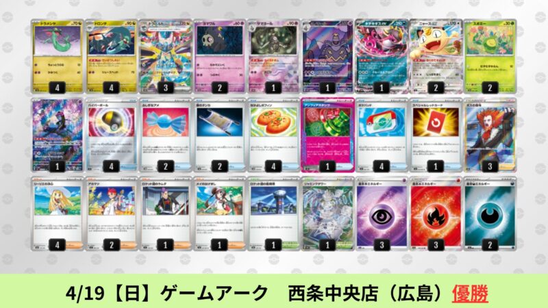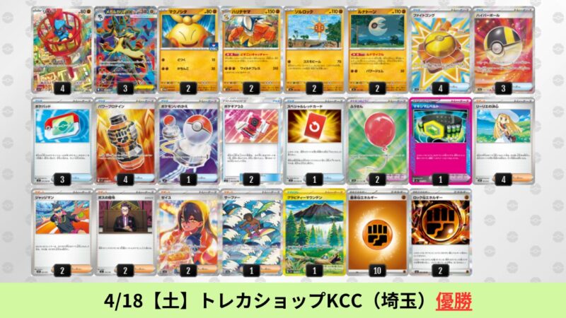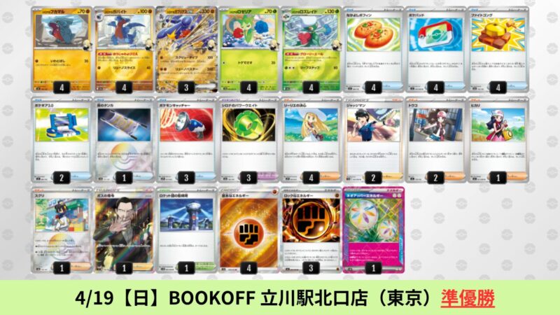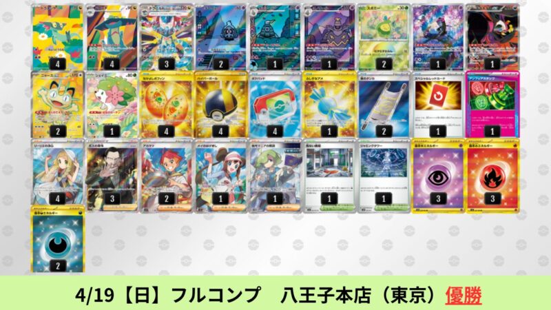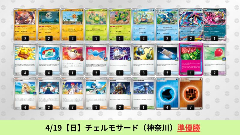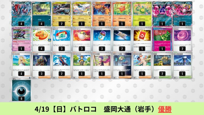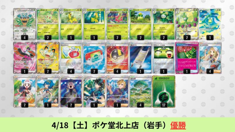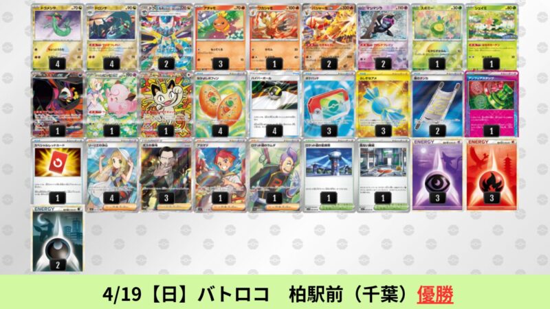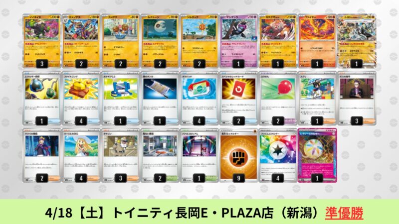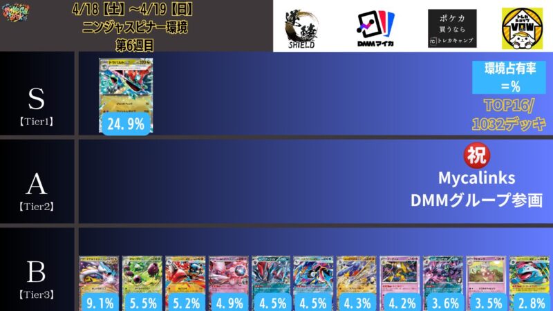 ドラパルトexを起点として、そのドラパルトexに強いたねポケモンex主体デッキ(タケルライコ、オーガポン等)、さらにそのたねポケモンex主体デッキに強い非ルールポケモンデッキ(フーディン、メタグロス、ドンカラス等)という構図をイメージせよ。環境をジャンル分けすると、この3ジャンルで環境が形成されている。 - 4/18【土】~4/19【日】の結果
