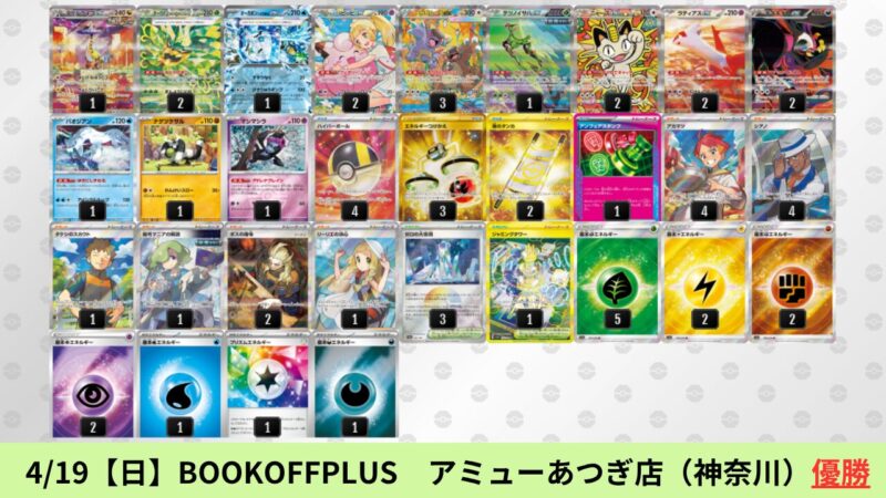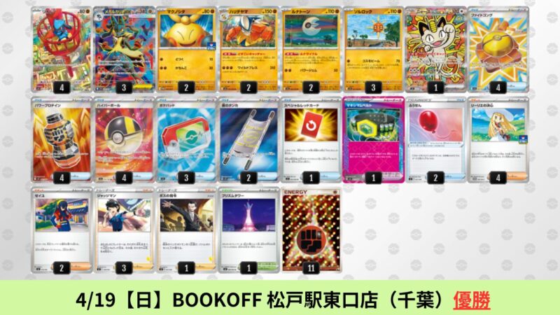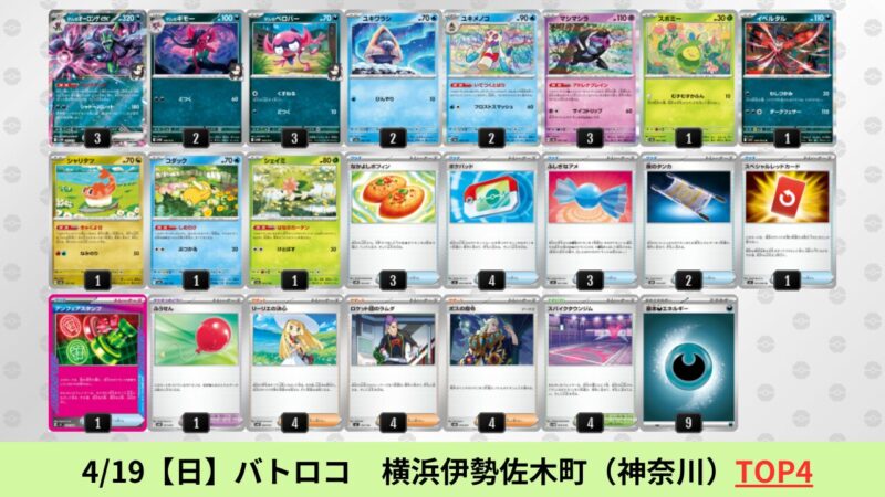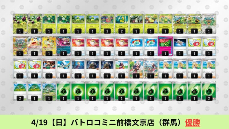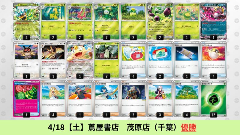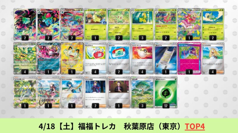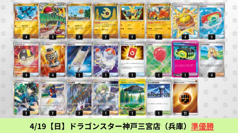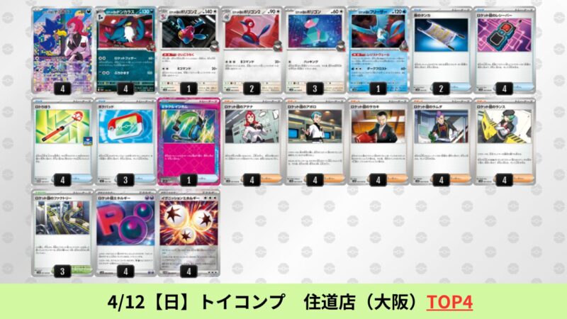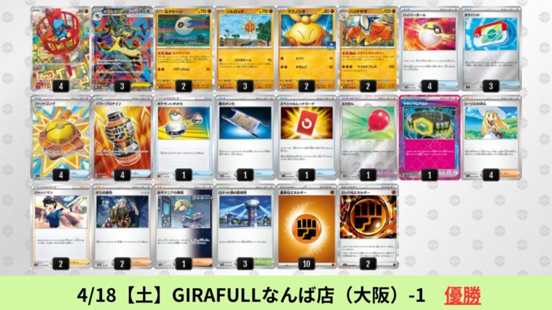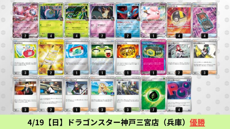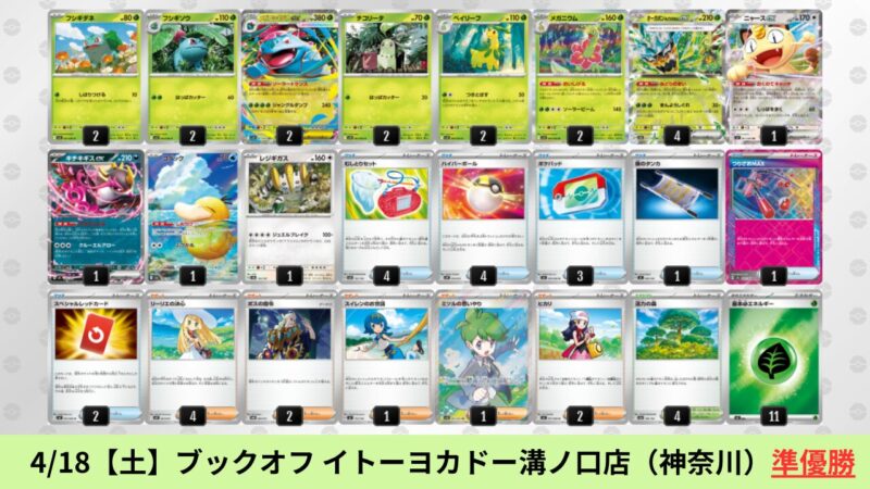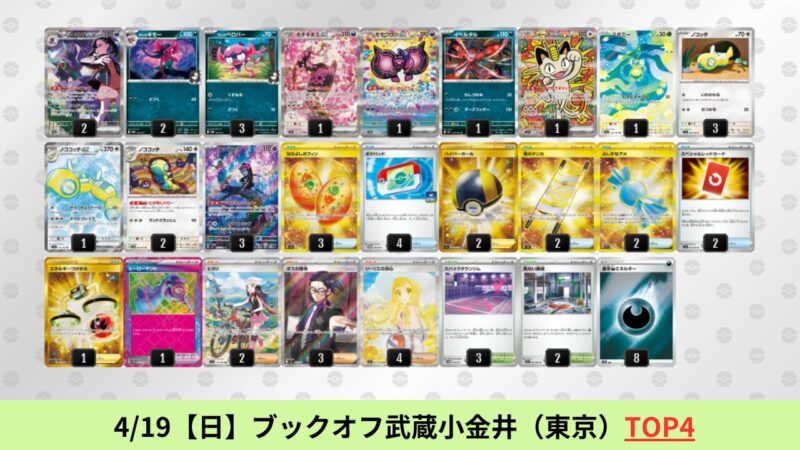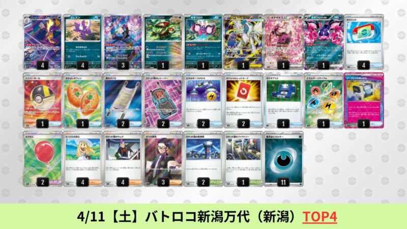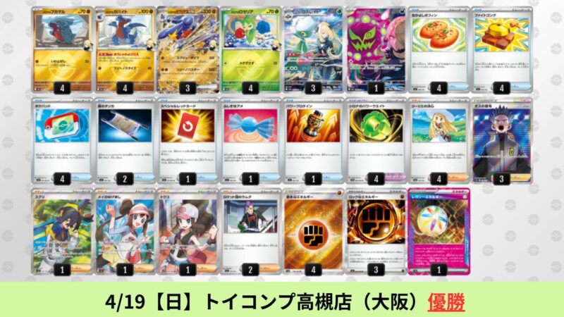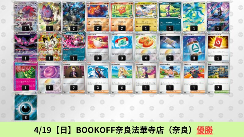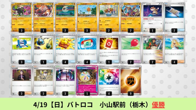 ドラパルトexを起点として、そのドラパルトexに強いたねポケモンex主体デッキ(タケルライコ、オーガポン等)、さらにそのたねポケモンex主体デッキに強い非ルールポケモンデッキ(フーディン、メタグロス、ドンカラス等)という構図をイメージせよ。環境をジャンル分けすると、この3ジャンルで環境が形成されている。 - 4/18【土】~4/19【日】の結果