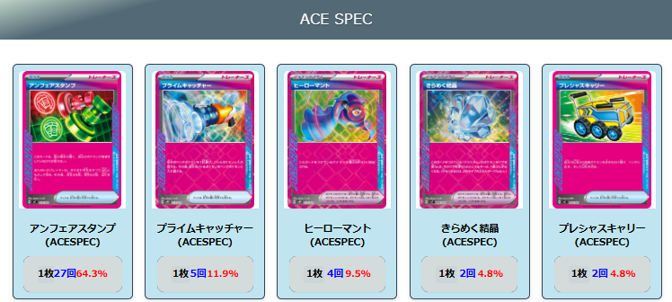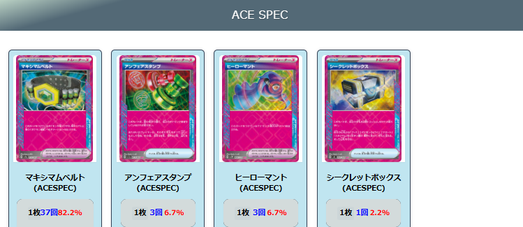 ガブリアス:ゾロアークと同様に環境から草タイプのデッキが減少したことで立ち位置が向上した。アクロマの執念と偉大な大樹を基盤とした構築が増加。他のエーススペックの人気も高く、エーススペックの判別が難しい状況となっている。数字上では非常に勝率の良いデッキ。