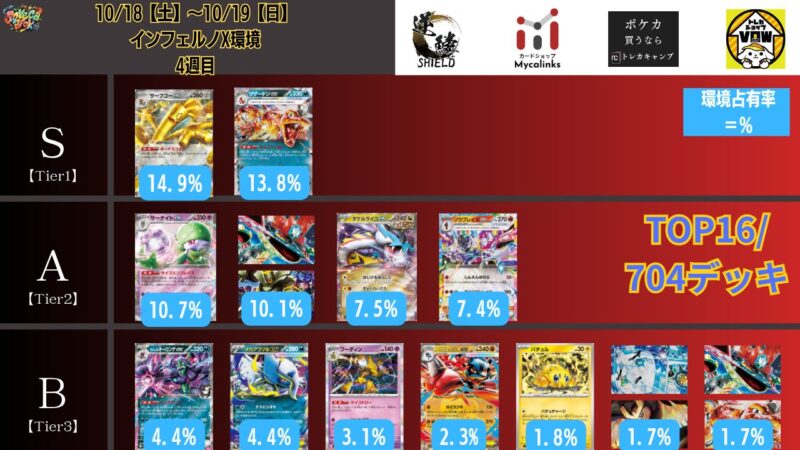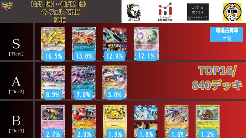 トーナメントシーンで活躍するポケモン群をポケカの環境デッキと言います。環境はTier上位のデッキで形成され、現在【R7/10/24】では、サーフゴーex.リザードンexが環境の中心にいるデッキです。