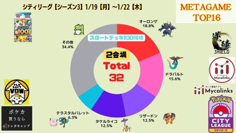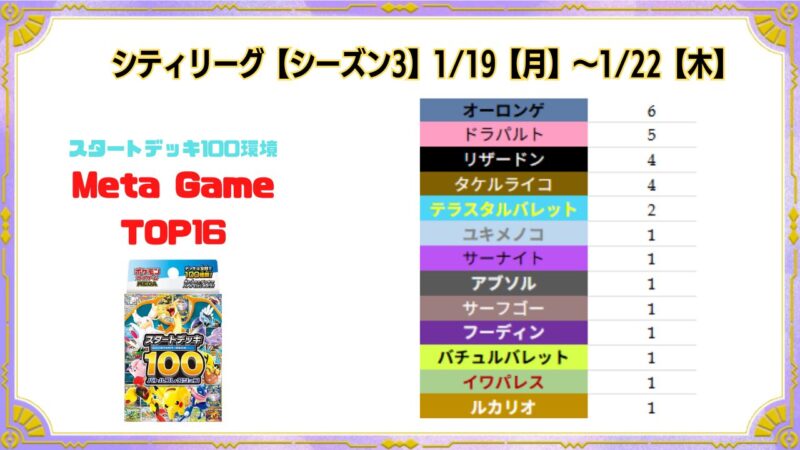 シティリーグ1/19【月】~1/22【木】ベスト16デッキまとめ X LINE 2026.01.19 目次 シティリーグ1/19【月】TSUTAYA西友町田店(東京)秋葉原チェルモ(東京)シティリーグ1/20【火】青馬堂矢向店(神奈川)バトロコ 柏駅前(千葉)竜のしっぽ 布施店(大阪)シティリーグ1/21【水】BOOKOFF奈良法華寺店(奈良)ポケ堂 仙台店(宮城)ドラゴンスター日本橋2号店(大阪)Card Secret(東京)シティリーグ1/22【木】ドラゴンスター日本橋3号店(大阪)竜星のPAO 大宮店(埼玉) シティリーグ1/19【月】 TSUTAYA西友町田店(東京) 大会結果 優勝 準優勝 TOP4 TOP4 TOP8 TOP8 TOP8 TOP8 TOP16 TOP16 TOP16 TOP16 TOP16 TOP16 TOP16 TOP16 秋葉原チェルモ(東京) 大会結果 優勝 準優勝 TOP4 TOP4 TOP8 TOP8 TOP8 TOP8 TOP16 TOP16 TOP16 TOP16 TOP16 TOP16 TOP16 TOP16 シティリーグ1/20【火】 青馬堂矢向店(神奈川) バトロコ 柏駅前(千葉) 竜のしっぽ 布施店(大阪) シティリーグ1/21【水】 BOOKOFF奈良法華寺店(奈良) ポケ堂 仙台店(宮城) ドラゴンスター日本橋2号店(大阪) Card Secret(東京) シティリーグ1/22【木】 ドラゴンスター日本橋3号店(大阪) 竜星のPAO 大宮店(埼玉)