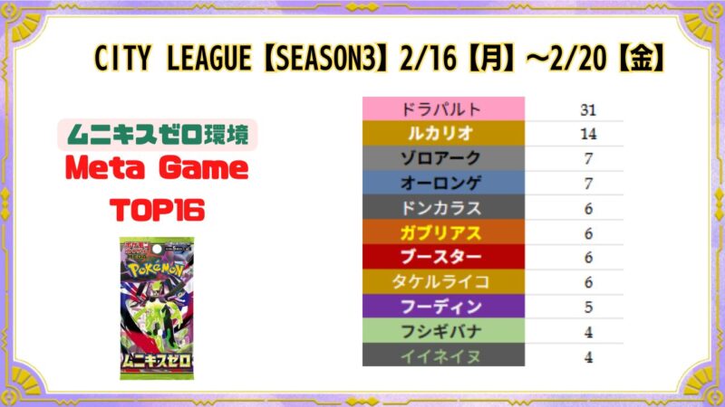 シティリーグ2/16【月】~2/20【金】ベスト16デッキまとめ X LINE 2026.02.162026.02.23 目次 シティリーグ2/16【月】TSUTAYA西友町田店(東京)シティリーグ2/17【火】青馬堂矢向店(神奈川)バトロコ 柏駅前(千葉)竜星のPAO 大宮店(埼玉)竜のしっぽ 布施店(大阪)シティリーグ2/18【水】ドラゴンスター日本橋2号店(大阪)シティリーグ2/19【木】ドラゴンスター日本橋3号店(大阪)秋葉原チェルモ(東京)シティリーグ2/20【金】 シティリーグ2/16【月】 TSUTAYA西友町田店(東京) 大会結果 優勝 準優勝 TOP4 TOP4 TOP8 TOP8 TOP8 TOP8 TOP16 TOP16 TOP16 TOP16 TOP16 TOP16 TOP16 TOP16 シティリーグ2/17【火】 青馬堂矢向店(神奈川) 大会結果 優勝 準優勝 TOP4 TOP4 TOP8 TOP8 TOP8 TOP8 TOP16 TOP16 TOP16 TOP16 TOP16 TOP16 TOP16 TOP16 バトロコ 柏駅前(千葉) 大会結果 優勝 準優勝 TOP4 TOP4 TOP8 TOP8 TOP8 TOP8 TOP16 TOP16 TOP16 TOP16 TOP16 TOP16 TOP16 TOP16 竜星のPAO 大宮店(埼玉) 大会結果 優勝 準優勝 TOP4 TOP4 TOP8 TOP8 TOP8 TOP8 TOP16 TOP16 TOP16 TOP16 TOP16 TOP16 TOP16 TOP16 竜のしっぽ 布施店(大阪) 大会結果 優勝 準優勝 TOP4 TOP4 TOP8 TOP8 TOP8 TOP8 TOP16 TOP16 TOP16 TOP16 TOP16 TOP16 TOP16 TOP16 シティリーグ2/18【水】 ドラゴンスター日本橋2号店(大阪) 大会結果 優勝 準優勝 TOP4 TOP4 TOP8 TOP8 TOP8 TOP8 TOP16 TOP16 TOP16 TOP16 TOP16 TOP16 TOP16 TOP16 シティリーグ2/19【木】 ドラゴンスター日本橋3号店(大阪) 優勝 準優勝 TOP4 TOP4 TOP8 TOP8 TOP8 TOP8 TOP16 TOP16 TOP16 TOP16 TOP16 TOP16 TOP16 TOP16 秋葉原チェルモ(東京) 大会結果 優勝 準優勝 TOP4 TOP4 TOP8 TOP8 TOP8 TOP8 TOP16 TOP16 TOP16 TOP16 TOP16 TOP16 TOP16 TOP16 シティリーグ2/20【金】 開催なし