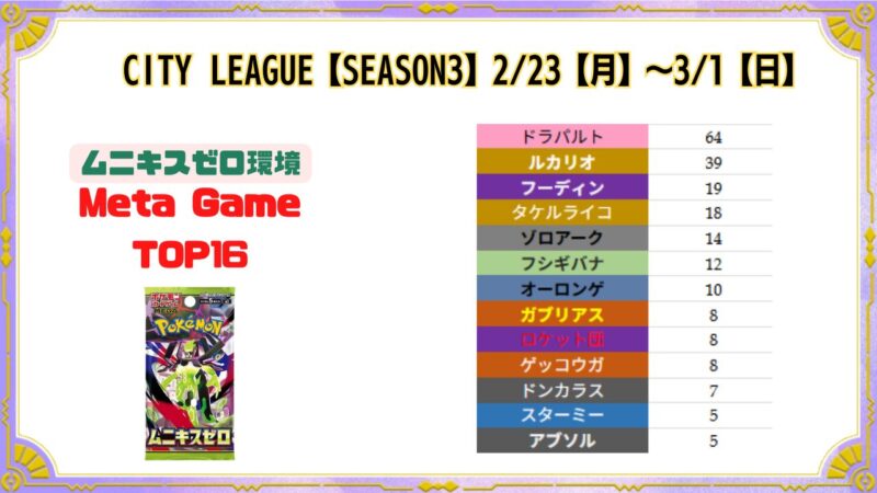 シティリーグ2/24【火】~2/28【土】ベスト16デッキまとめ X LINE 2026.02.24 目次 シティリーグ2/24【火】青馬堂矢向店(神奈川)バトロコ 藤沢駅北口(神奈川)シティリーグ2/25【水】GIRAFULL京都店(京都)シティリーグ2/26【木】ドラゴンスター日本橋3号店(大阪)トレカショップVOW(滋賀)シティリーグ2/27【金】Torecacamp大須店(愛知)バトロコ 高田馬場(東京)ドラゴンスター池袋店(東京)シティリーグ2/28【土】福福トレカ 秋葉原店(東京)BOOKOFF 西友大森店(東京)トレカショップKCC(埼玉)ブックオフ イトーヨカドー溝ノ口店(神奈川)BOOKOFF町田中央通り店(東京)BOOKOFF立川駅北口店(東京)バトロコ 横浜伊勢佐木町(神奈川)バトロコミニ十和田店(青森)バトロコ 本厚木駅前(神奈川) シティリーグ2/24【火】 青馬堂矢向店(神奈川) 大会結果 優勝 準優勝 TOP4 TOP4 TOP8 TOP8 TOP8 TOP8 TOP16 TOP16 TOP16 TOP16 TOP16 TOP16 TOP16 TOP16 バトロコ 藤沢駅北口(神奈川) 大会結果 優勝 準優勝 TOP4 TOP4 TOP8 TOP8 TOP8 TOP8 TOP16 TOP16 TOP16 TOP16 TOP16 TOP16 TOP16 TOP16 シティリーグ2/25【水】 GIRAFULL京都店(京都) シティリーグ2/26【木】 ドラゴンスター日本橋3号店(大阪) トレカショップVOW(滋賀) シティリーグ2/27【金】 Torecacamp大須店(愛知) バトロコ 高田馬場(東京) ドラゴンスター池袋店(東京) シティリーグ2/28【土】 福福トレカ 秋葉原店(東京) BOOKOFF 西友大森店(東京) トレカショップKCC(埼玉) ブックオフ イトーヨカドー溝ノ口店(神奈川) BOOKOFF町田中央通り店(東京) BOOKOFF立川駅北口店(東京) バトロコ 横浜伊勢佐木町(神奈川) バトロコミニ十和田店(青森) バトロコ 本厚木駅前(神奈川)